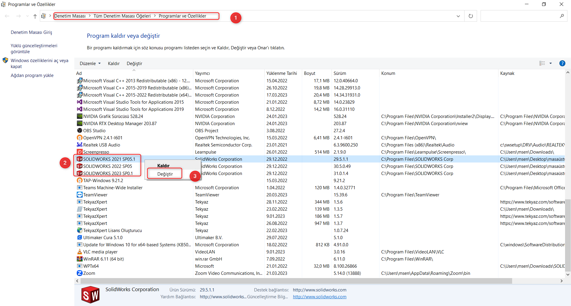 - Windows Denetim Masası aracını açın ve orada Programlar ve Özellikler’e gidiniz. Programlar listesinde SOLIDWORKS veya Composer kurulumunu bulun ve Değiştir’i seçiniz.