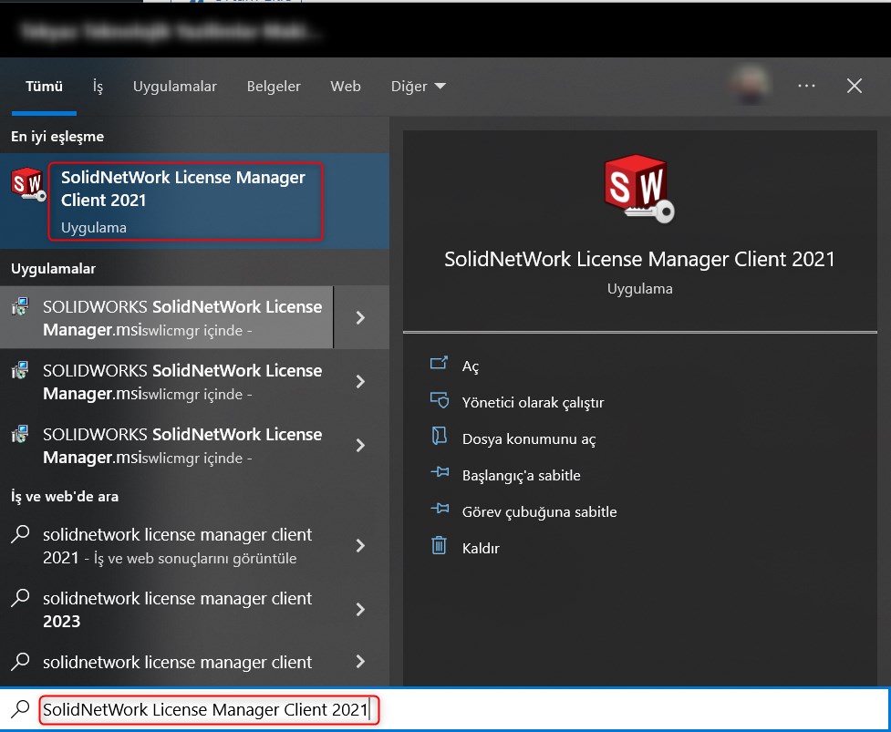 - İstemci uygulamasını başlatın – (Windows Başlat Menüsü > SOLIDWORKS Araçları > SolidNetWork Lisans Yöneticisi)