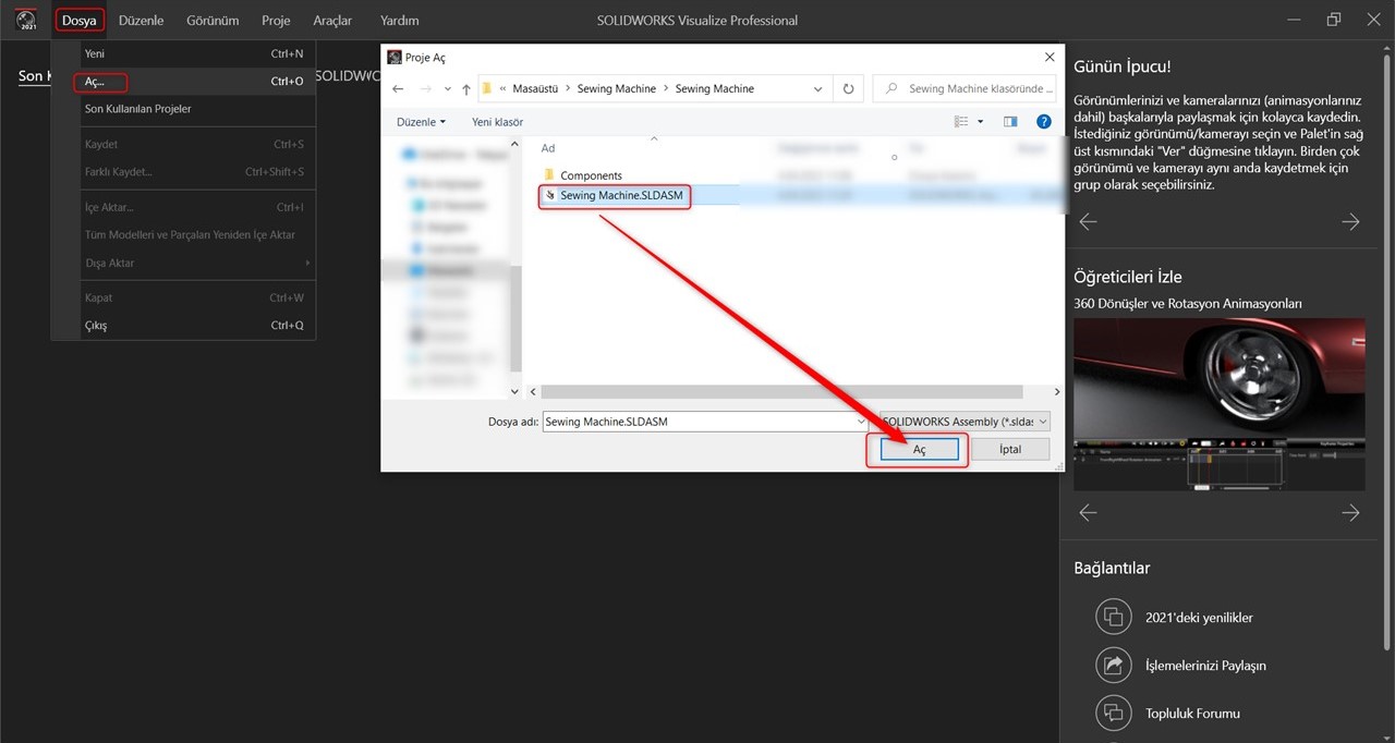Adım 1 – Parça veya montaj dosyasını SOLIDWORKS 2021 veya daha üst bir sürümde açın.