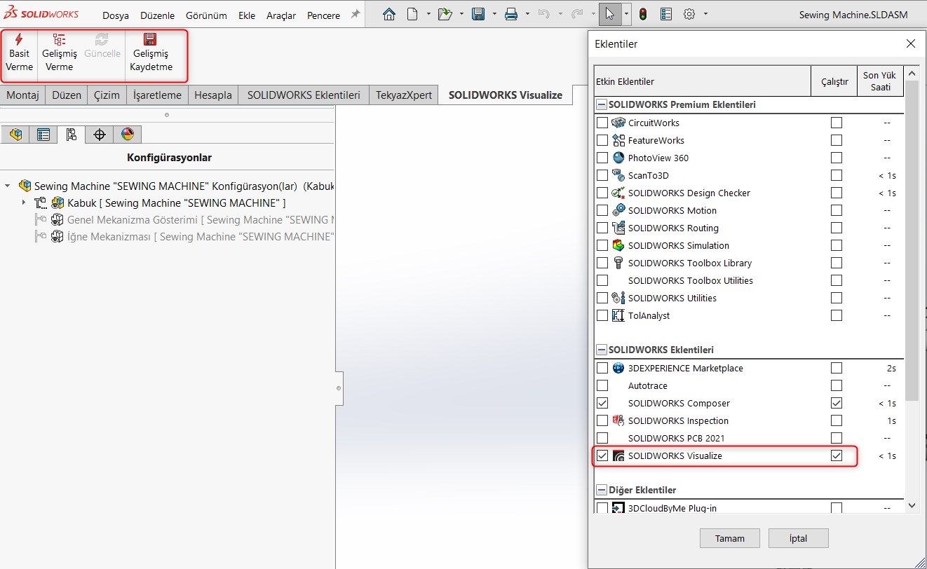 Adım 4 – Montaj dosyasını otomatik olarak bir görselleştirme projesi oluşturmak ve dışa aktarmak için Basit Verme veya Gelişmiş Verme seçeneklerinden birine tıklayınız. SOLIDWORKS Visualize Sekmesi görünmüyorsa eklentilerden SOLIDWORKS Visualize eklentinizin aktif olduğundan emin olunuz.